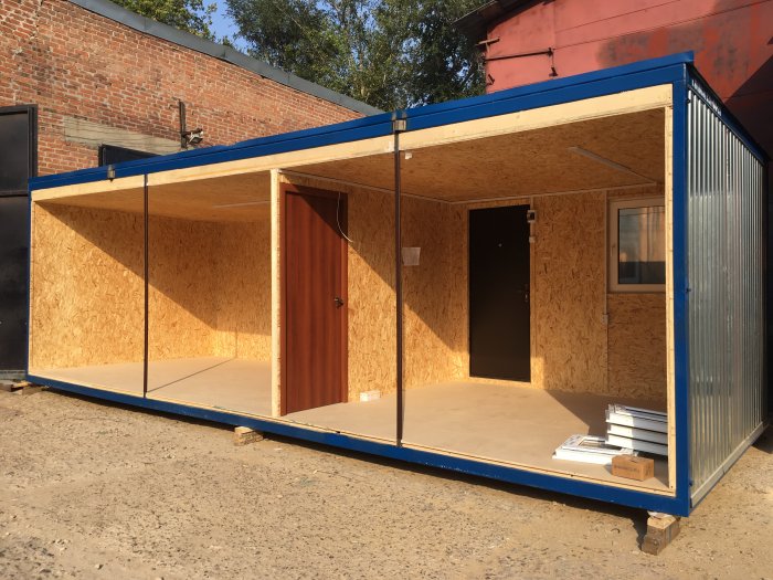 Модульные дома из блок-контейнеров с размерами 7.0x4.8x2.5 м. Внутренняя отделка выполнена из OSB, внешняя - Оцинкованный. Бытовка оснащена 4 шт. окнами/окном и дверью. Термоизоляция и гидроизоляция бытовки состоит из: Полиэтиленовая пленка 100 мкм. и KNAUF Insulation Термо 50 мм., что позволяет сохранять приемлемую температуру в помещении. Срок гарантии составляет: 6 мес. Страна производства - .